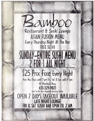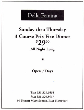 East Hampton Point, 296 Three Mile Harbor Road, East Hampton, (631) 329-2800. The snappy, shipshape white and blue dining rooms, decks, bar and marina of what is now called East Hampton Point command an unobstructed view of Three Mile Harbor (facing west into the sunset). The team of Della Femina, Ben Krupinski and Larry Dunst, who wet their feet late last summer with Della Femina on North Main Street in East Hampton, also includes Drew Nienporent, who manages both Della Femina and East Hampton Point. The experienced Mr. Nienporent (also of Montrachet and TriBeCa Grill in Manhattan) handles the crush of visitors demanding tables every weekend at East Hampton Point. Once seated, diners can select the chef Gerry Hayden's commendable sweet corn and Manila clam chowder, chunky crab and cod cakes or roasted vegetable terrine to start, then a fist-sized hunk of swordfish with couscous or silky roasted cod with eggplant. Meltingly tender lamb shank, hardly summery fare, was delicious all the same. Desserts, especially the berry tart, are excellent. Main dishes are $17 to $23. At the bar (which is dwarfed by a handsome 5.5 Meter sloop that sits nearby) and on the deck, there is a light seafood-orientated menu drawn largely from the list of appetizers, at prices mostly in the $5 to $12 range. |