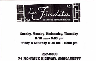Mexican. Located just off of East Hampton's village parking lot (but not right on it), this is a family-style restaurant disguised as a Mexican cantina. Popular as a watering hole or for light dining before or after a movie across the street, its only problem is the occasional wait for a table. But once the wait is over, the waitstaff tries its best to please.